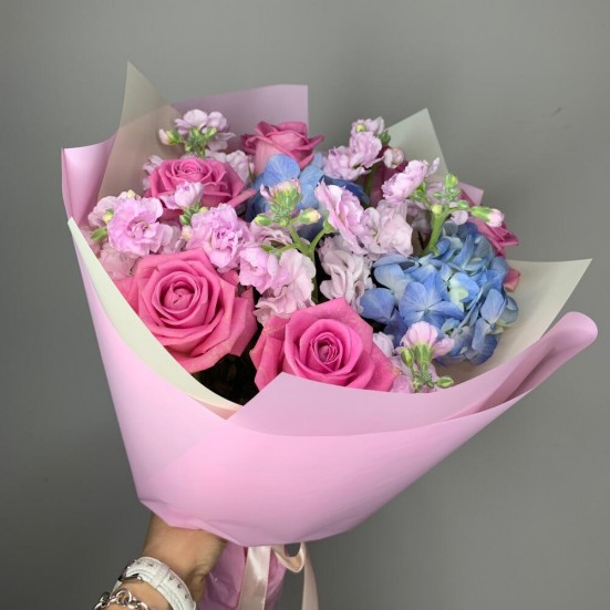 Букет с голубой гортензией и розами в Тобольске