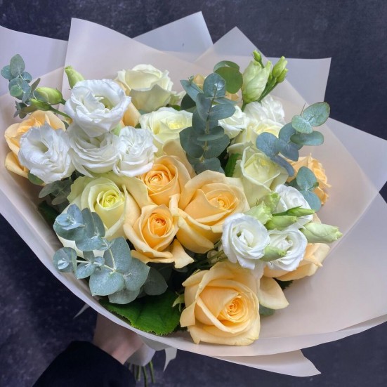 Букет из роз, эустомы и эвкалипта в Тобольске