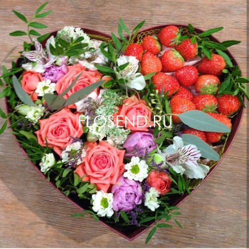 Цветы и макаронс маме в коробке сердце в Тобольске