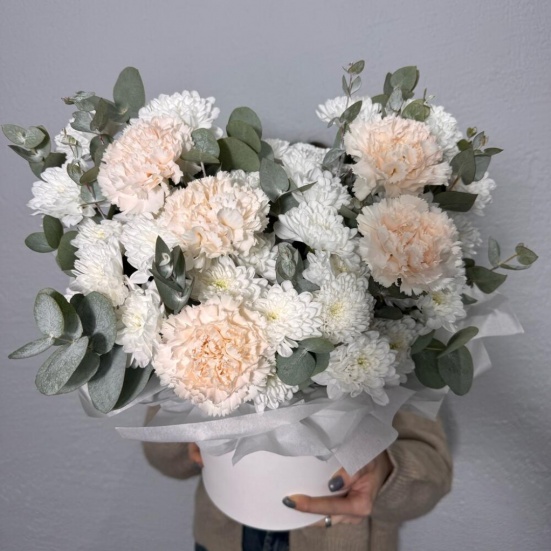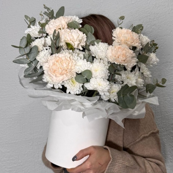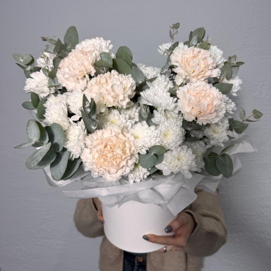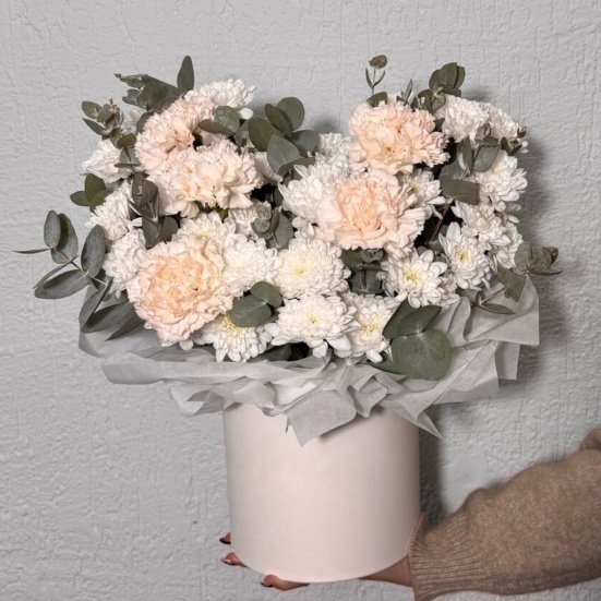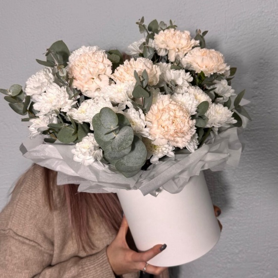 Коробка из кустовых хризантем и диантуса в Тобольске
